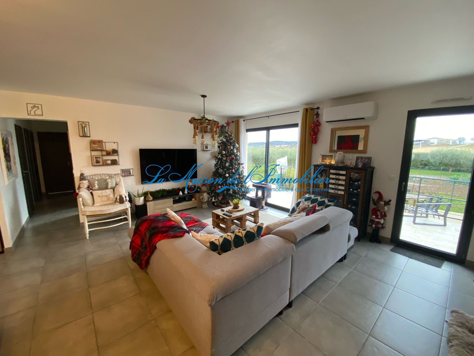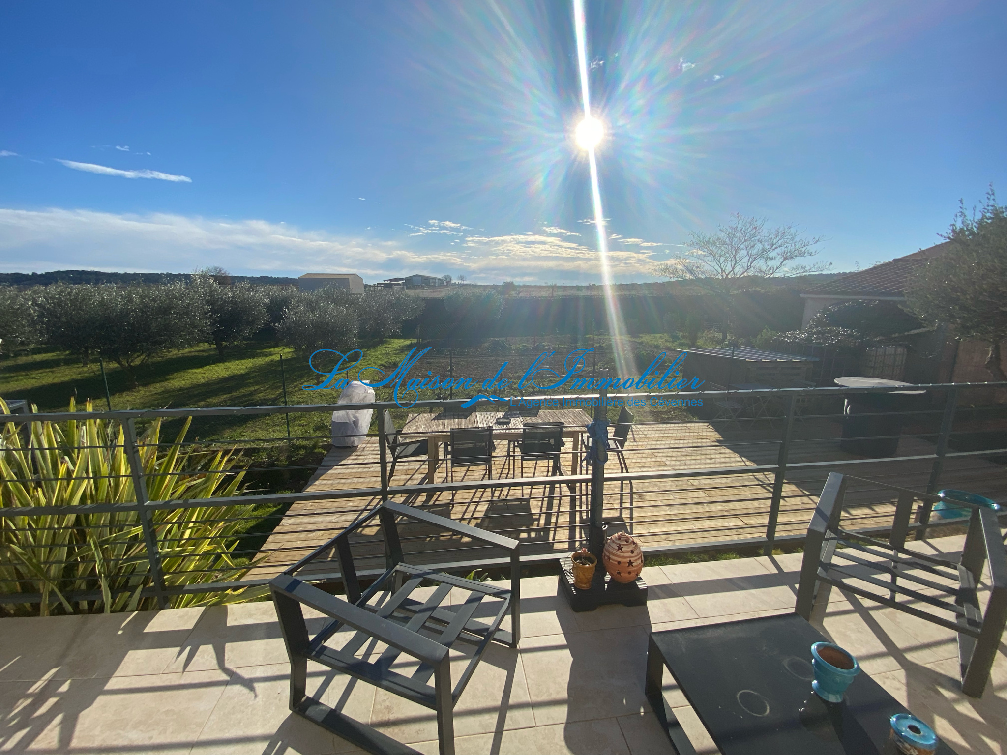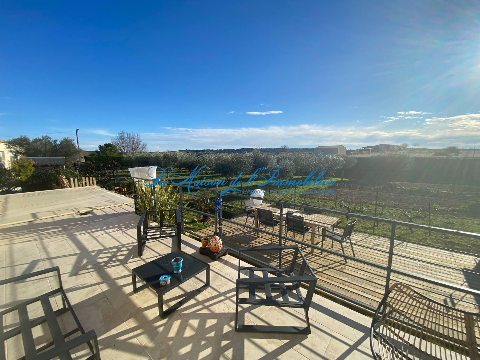 d’un bel espace séjour/salon avec cuisine équipée de 42 m² avec une baie vitrée donnant sur la terrase qui offre une vue imprenable sur un champs d'oliviers,