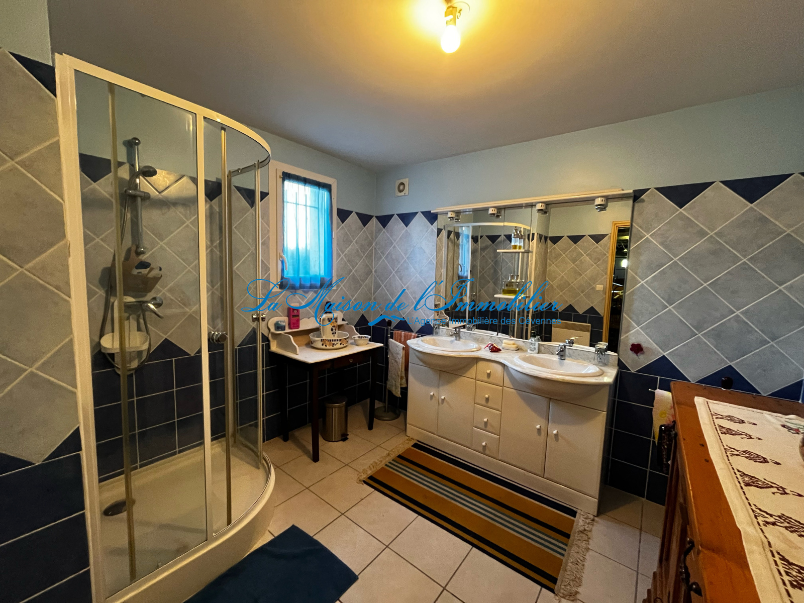 À l’étage, la maison dispose d’un séjour avec cheminée insert ouvrant sur une véranda, d’une cuisine séparée et entièrement équipée, de trois chambres, d’une salle d’eau et d’un WC indépendant.