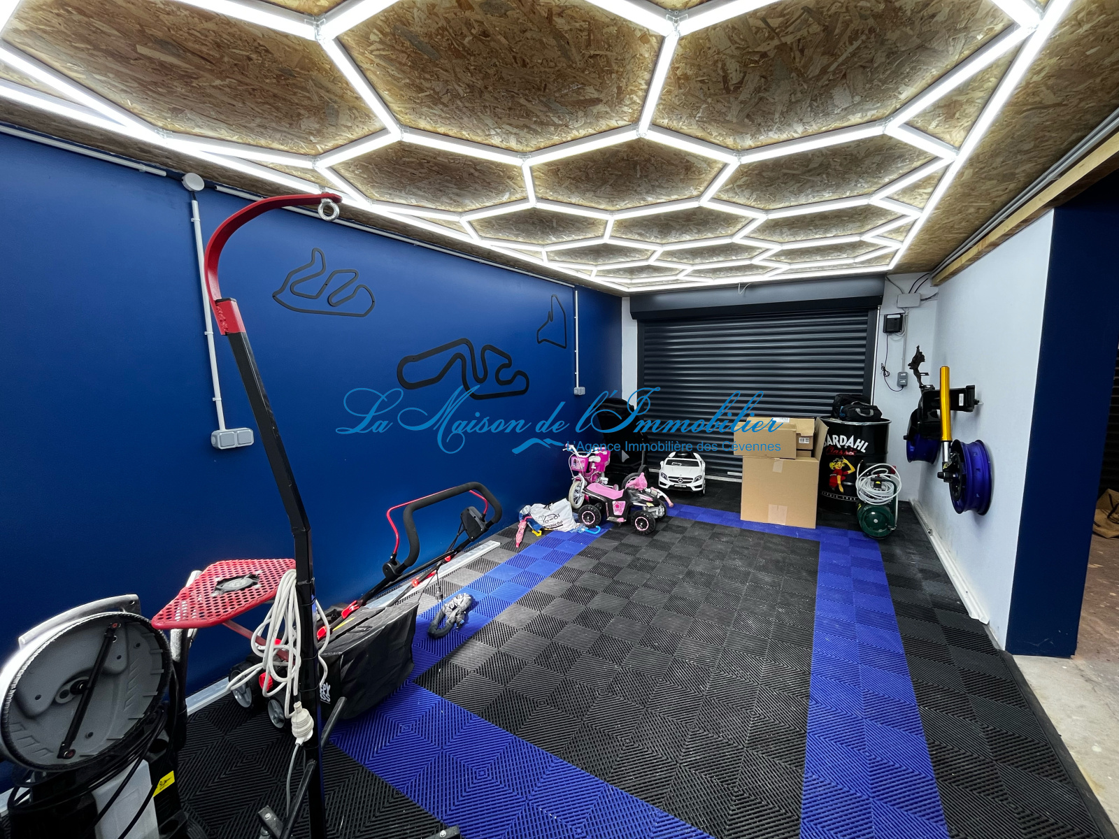 Le plus pour les amateurs de mécanique ou de belle voiture, un double garage de 43 m² entièrement aménagé